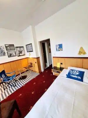 Retro-Themenzimmer mit Doppel- Boxspringbetten100 x 200 cm, alternativ getrennt oder zusammenstehend. Sessel - Tisch - Garderobe 18 - 24 qm inklusive Bad mit Dusche, WC. Auch als Einzelzimmer buchbar.
