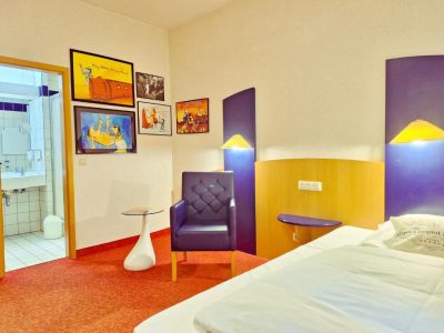 Retro Art Hotel Lünen-Themenzimmer mit Boxspringbett: 140 x 200 oder 100 x 210 cm, Sessel - Tisch - Garderobe 18 - 24 qm inklusive Bad mit Dusche, WC